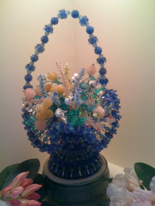 It is not so hard to do this really, although I was intimidated at first. Find a silver punch bowl, urn, or other container…then place a liner, followed by dirt, then the plants, fill air pockets with more dirt, cover with Spanish moss and add shells if you want and Voila!