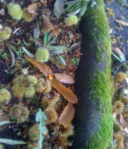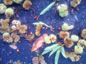 Here is a close up of these fabulous prickly nuts that have fallen from the tree. What are these?