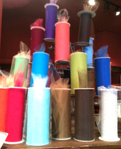 My favorite area of the store is the bargain bins, full of wonderful rolls I use for a variety of projects at a clearance price. My daughter had to have a little bit of many variations of pink, and she had quite a selection when she left. They also have a vintage cabinet full of velvet flowers, ribbon, pins, etc. that could keep a milliner entertained for quite some time.