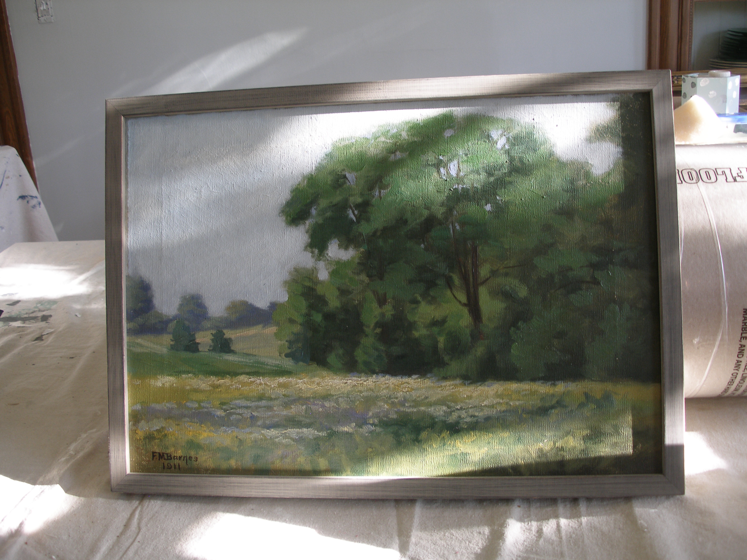 I had this vintage painting below framed over the Summer. It also captures the color palette I am after for this room. I chose a gray washed, simple, more modern frame than the original ornate gold one. What a difference!