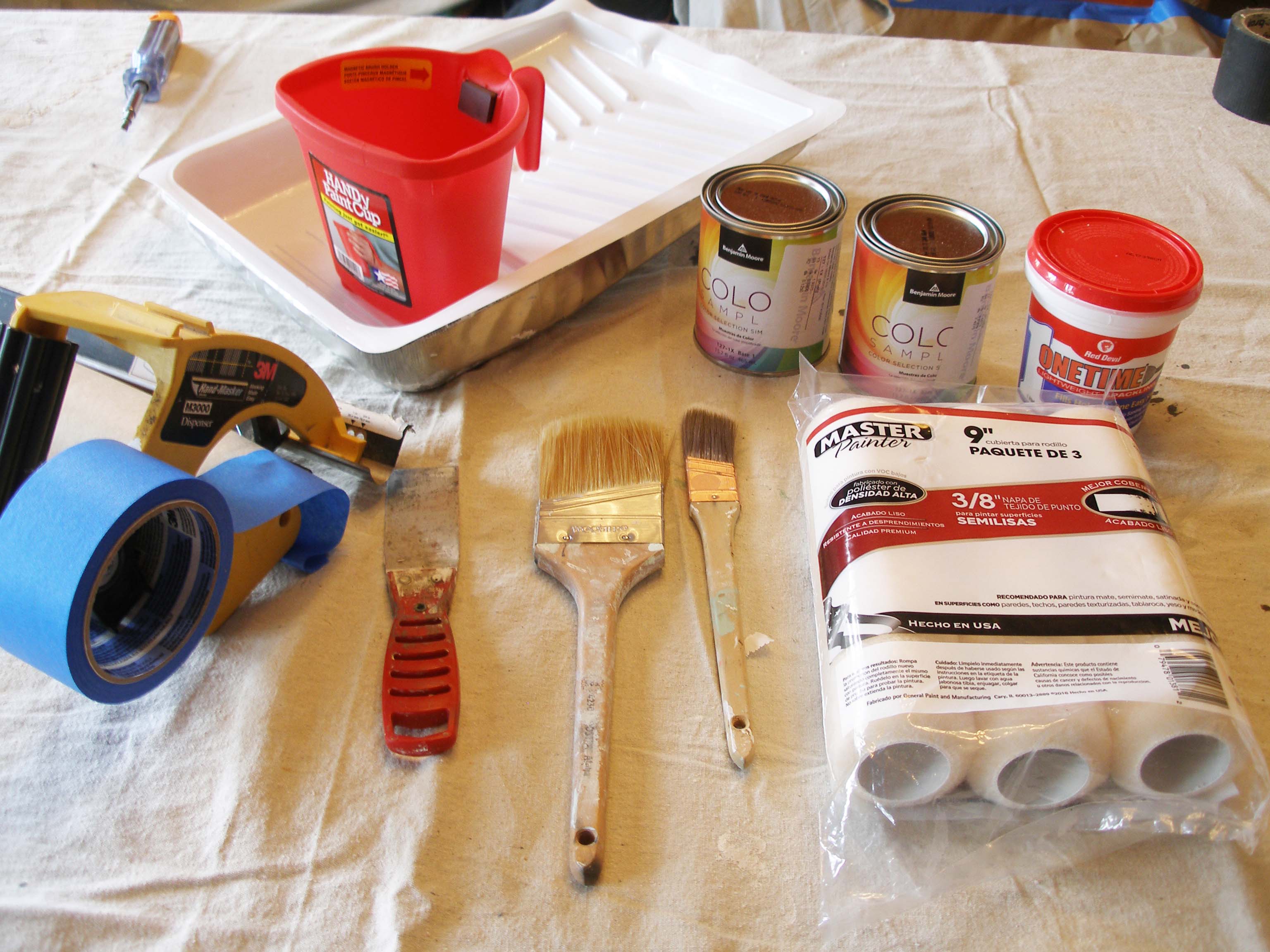 Below is pretty much what you need to paint. Blue tape and paper, spackling paste for patching walls, putty knife, sandpaper, brushes, rollers, paint cup, paint tray and liners, drop cloth, paint, a bucket of water and a rag.