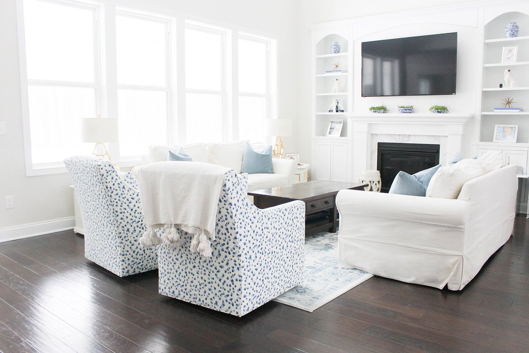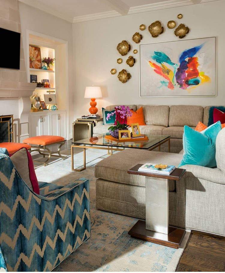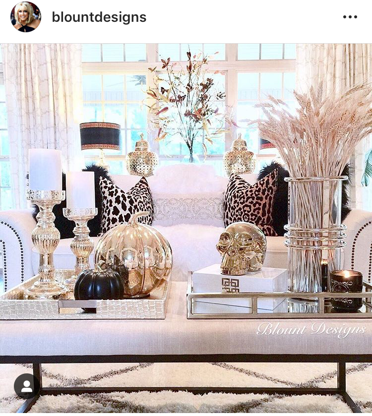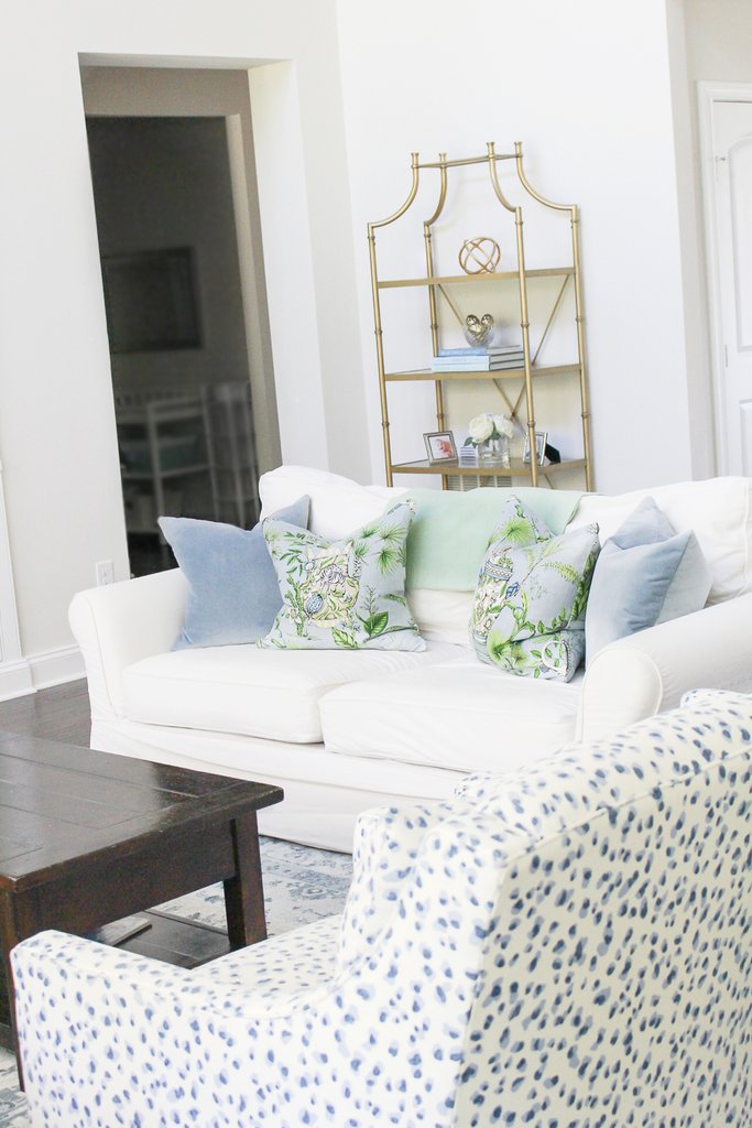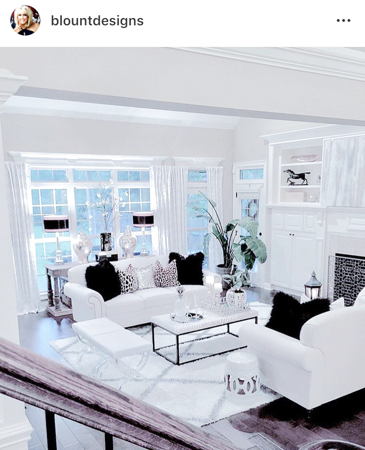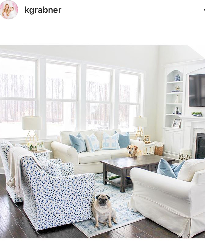 What’s fun about her posts is she transforms her white living room by switching out accent colors and accessories.