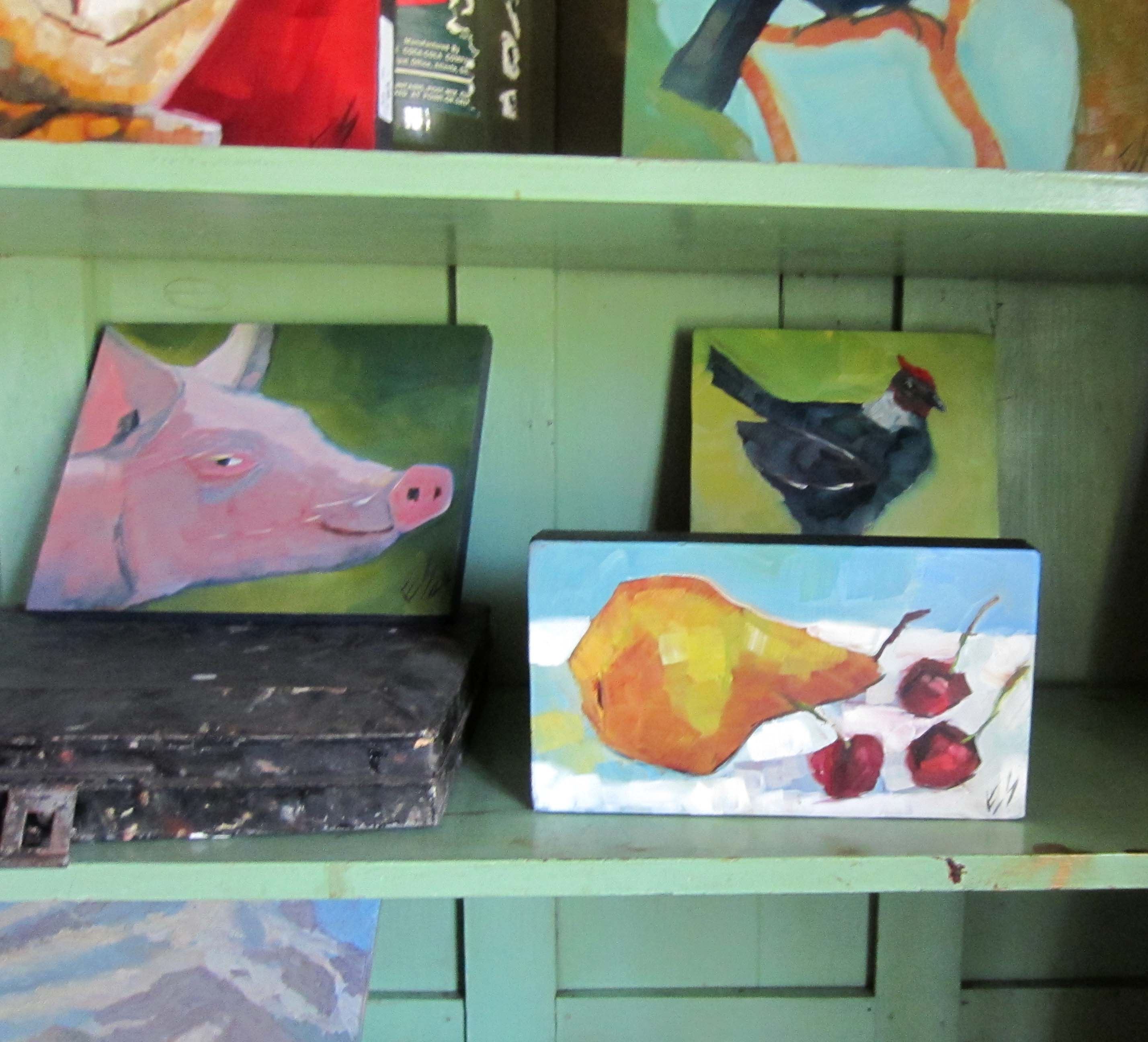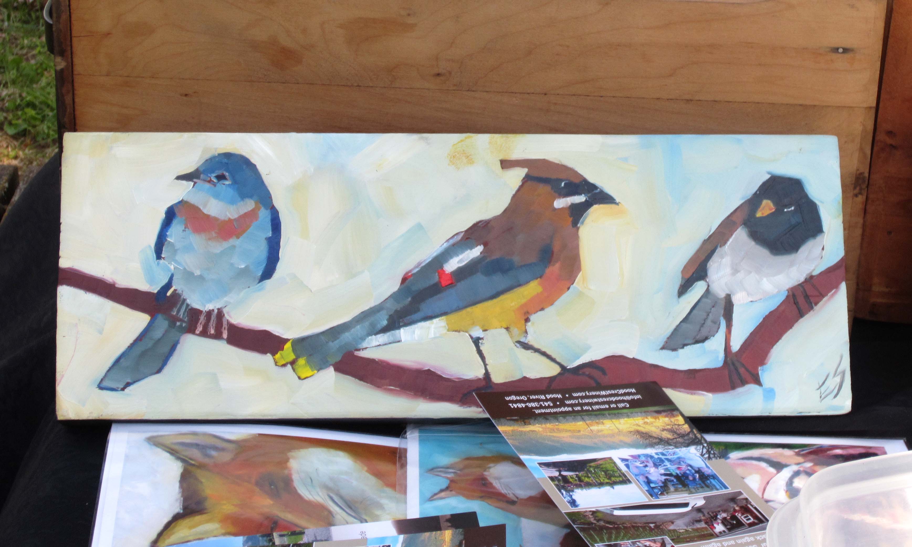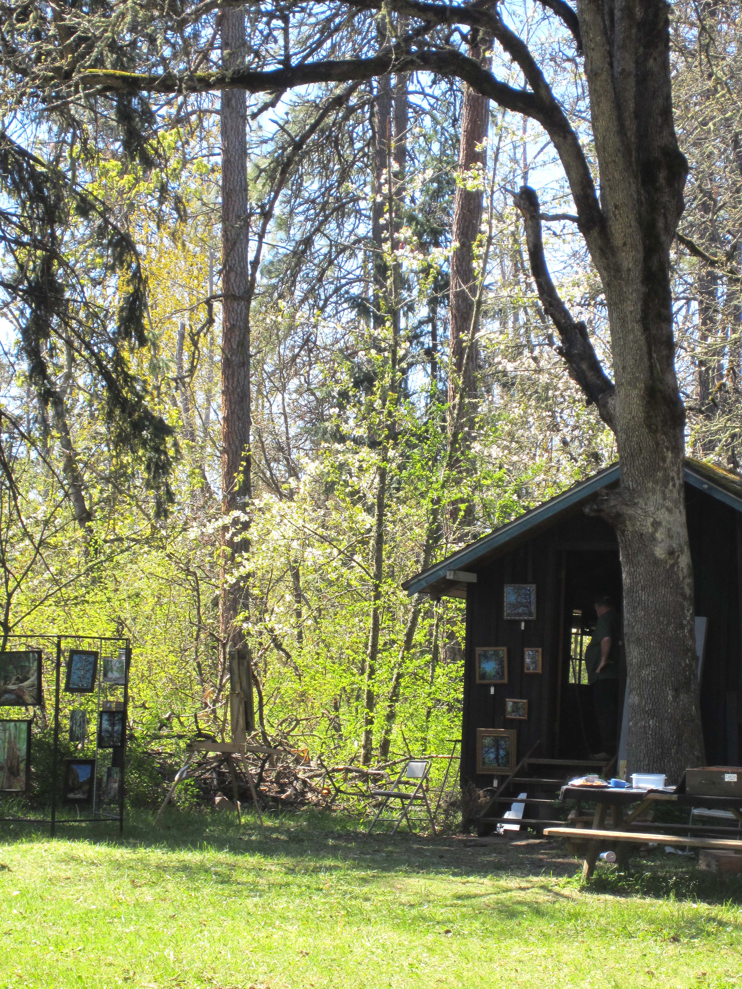 I went to see one of my favorite artists, Elizabeth See, an oil painter who paints all things found in nature – particularly animals and flowers. She uses oil paint on wood. She resides in White Salmon but brought her paintings to her great grandfather’s wood cabin, that was once his art studio. She even shared with us some of his landscape paintings that were still kickin’ around from the 40’s.