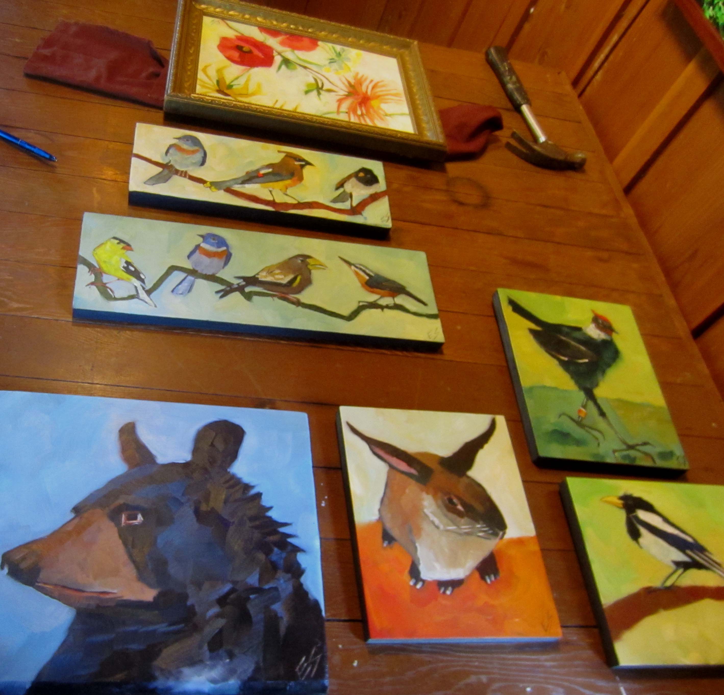This last shot is most of what went home with us. We couldn’t resist the local bird paintings and studies of a rabbit, a bear, a guinea pig, a game hen, a Magpie, A Great Horned Owl, and flowers. Her flower paintings are a favorite, but she was mostly out since she paints them in the Summer. She mostly had animals this time.