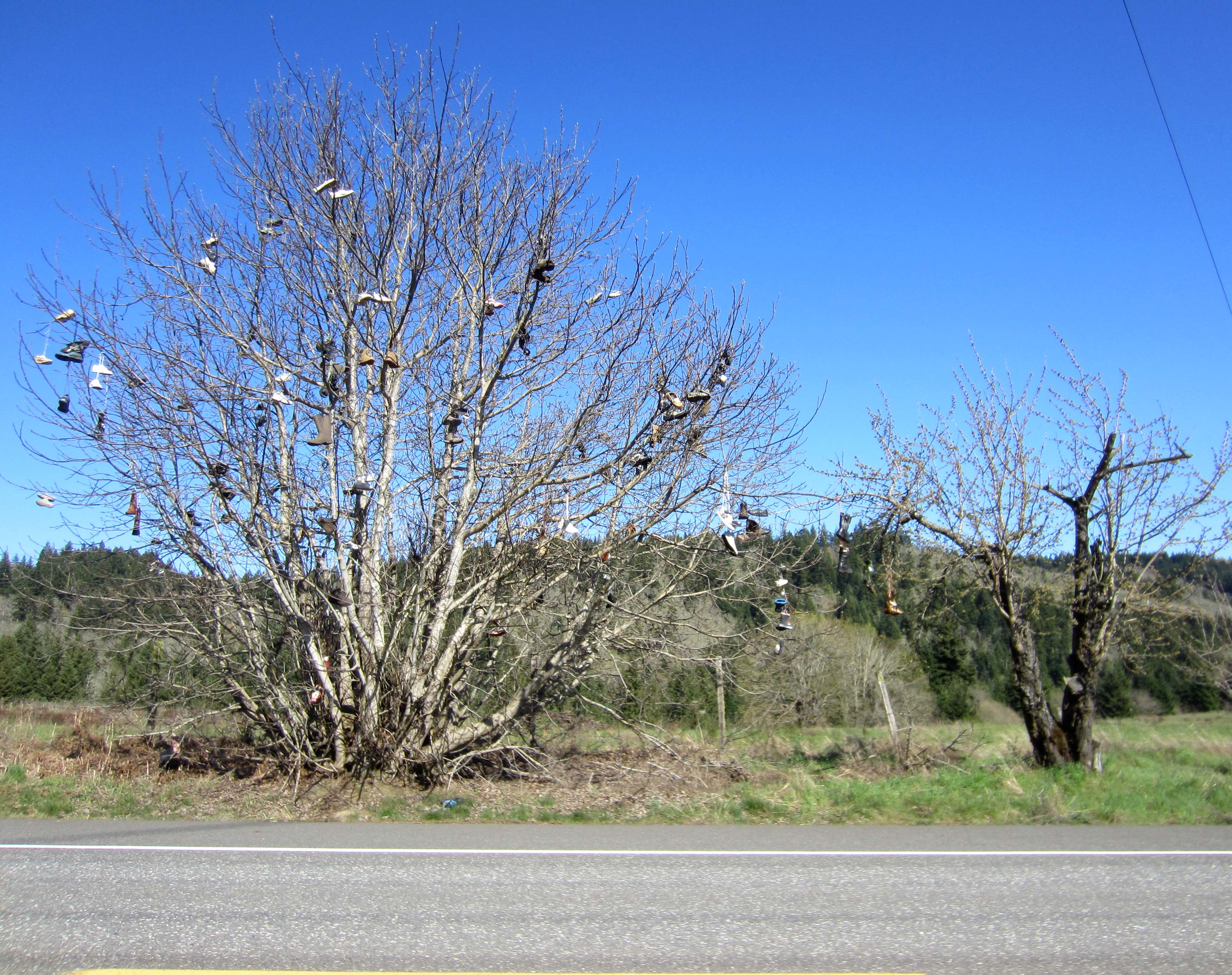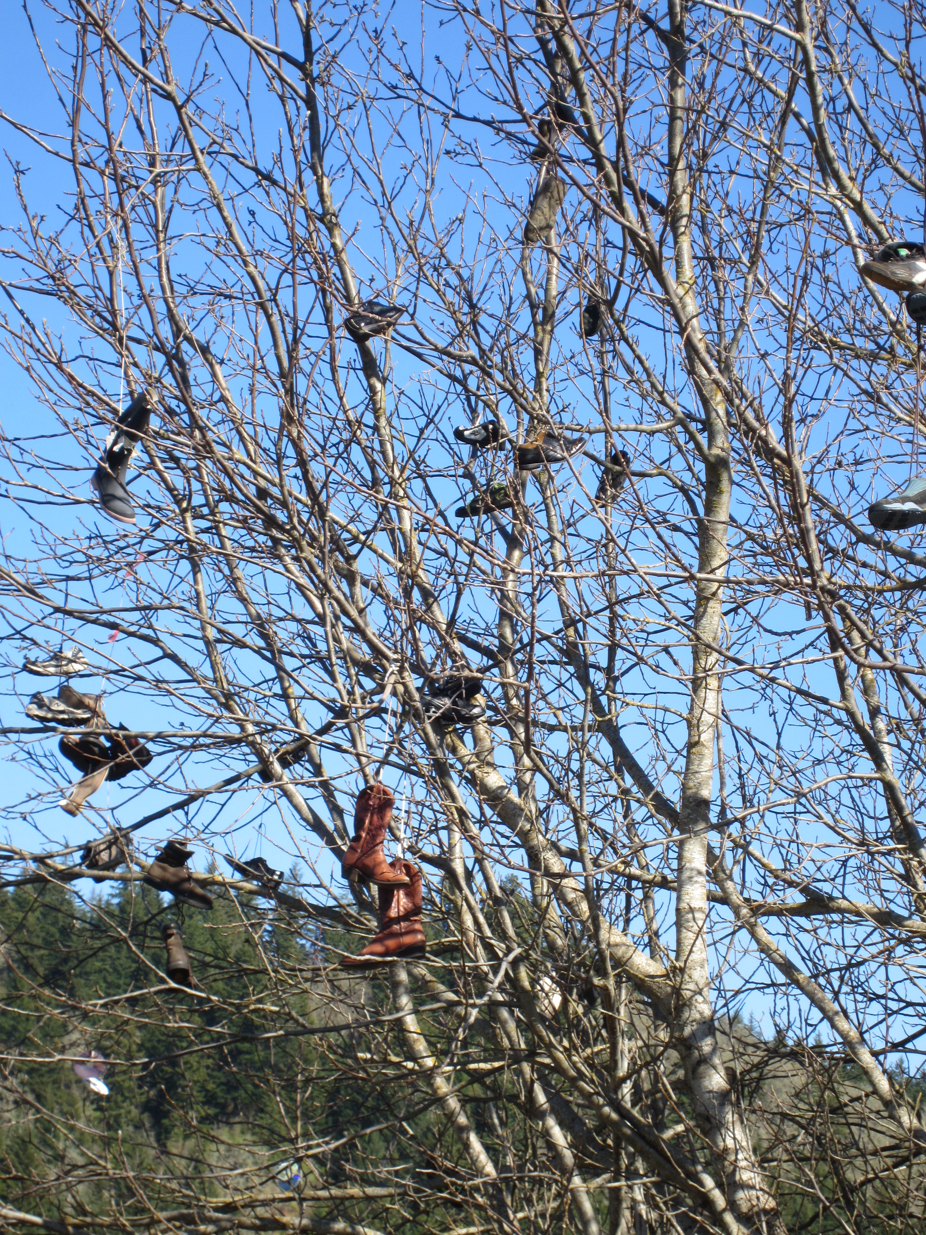 Spotted an artful tree on the way there, filled with sneakers, cowboy boots, work boots….curious for sure.