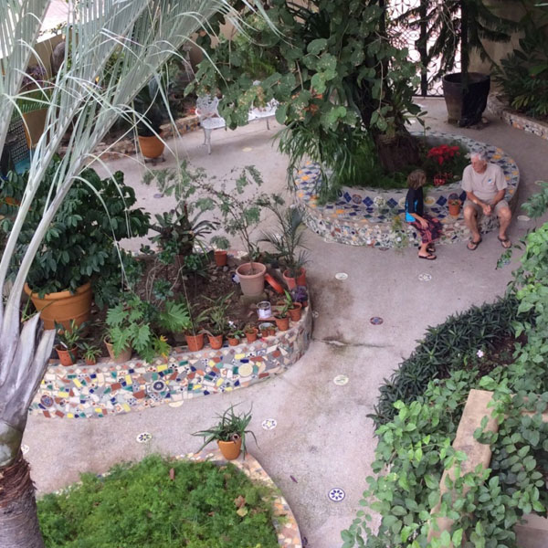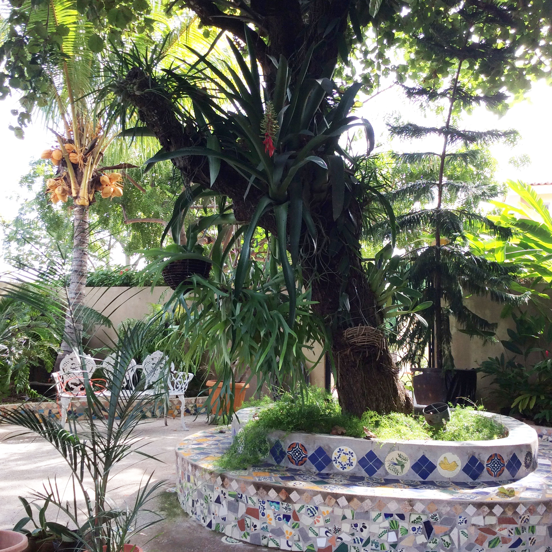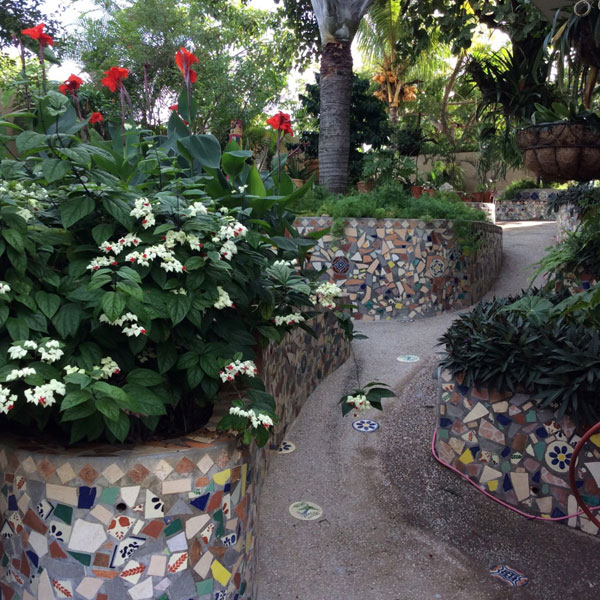 Lauren’s organic approach to the architectural elements in the garden are reminiscent of Antoni Gaudi’s Park Guell in Barcelona . There was so much rain, while painting the house (8 times), that to keep the workers busy, she diverted them to the garden. She had them break up the tiles and adorn the walls throughout the garden.