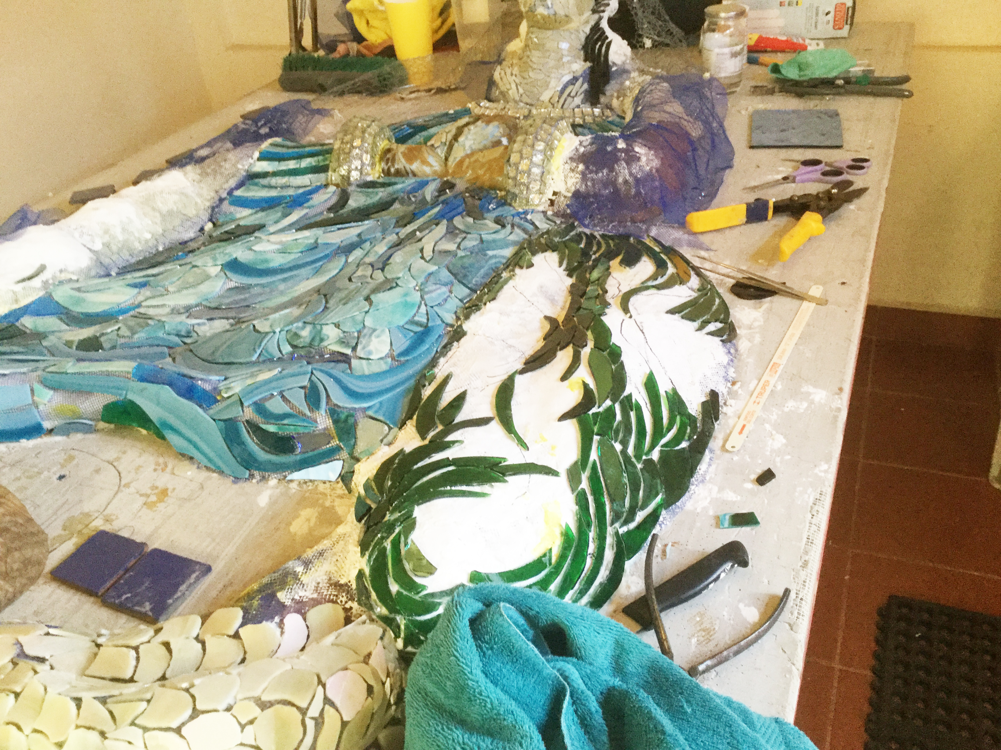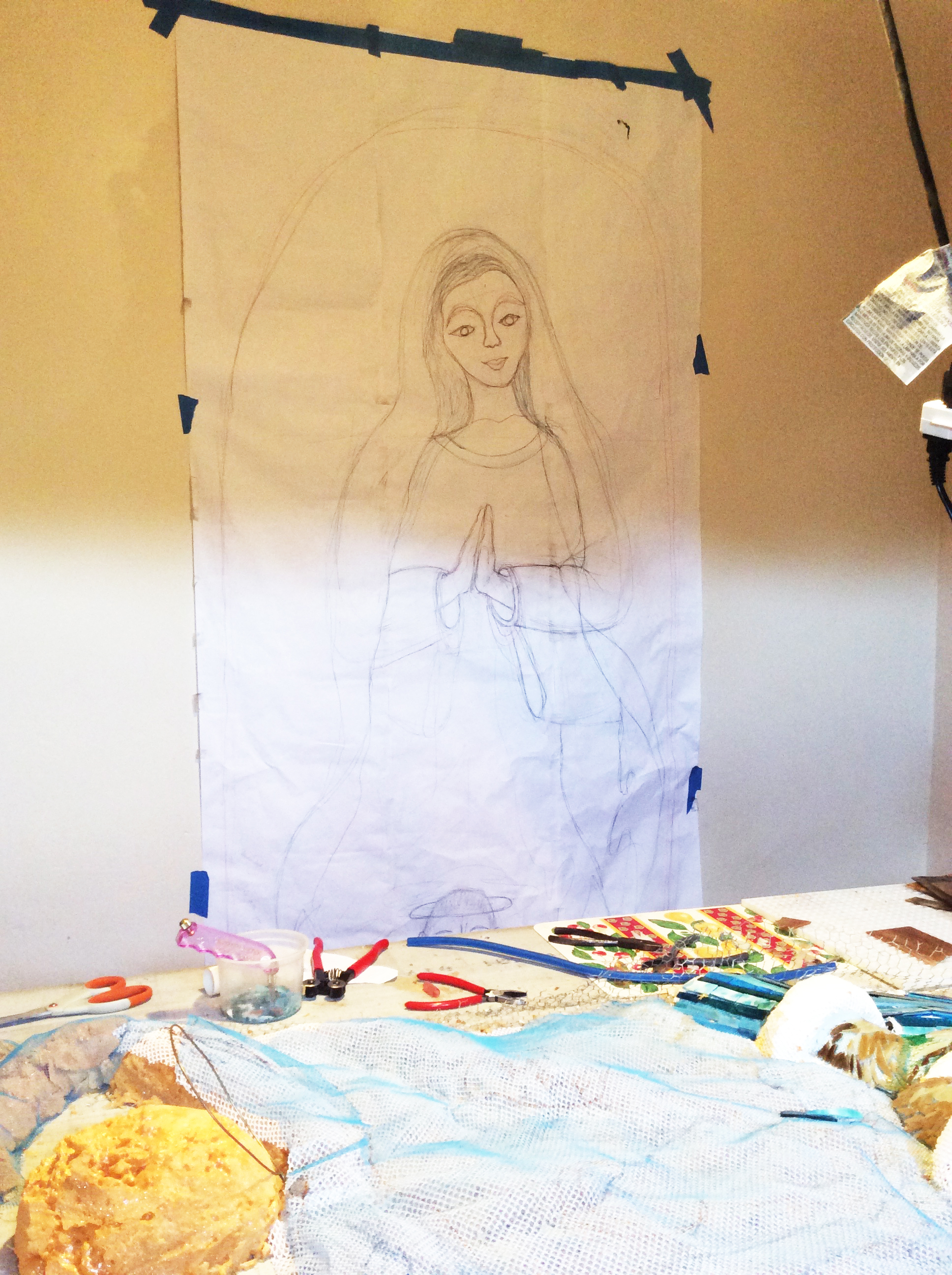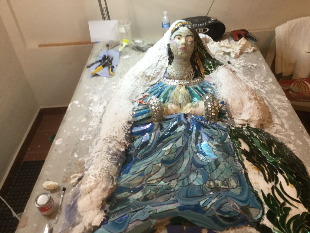 Lauren’s creative space where she is currently making a larger than life Virgin de Guadalupe out of glass mosaic pieces and found objects. Here are a few stages of her work, showing progress of this larger than life relief. This will ultimately be mounted on the exterior wall by the entry to the house.