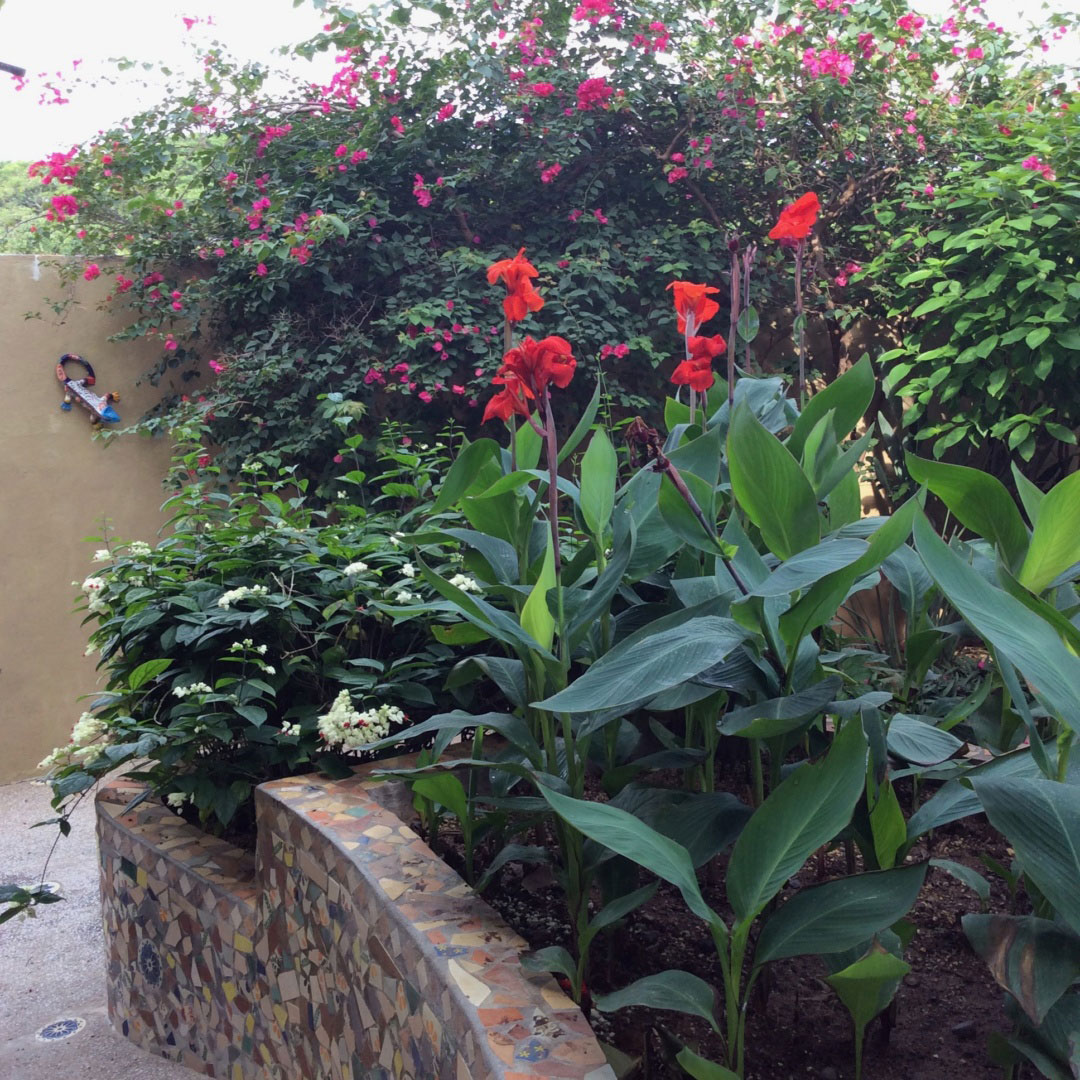 Lauren had 8 workers for 10 days working on the garden walls and pathways. They thought she was crazy when they were first breaking up the tiles. She went on a scavenger hunt all over Pto. Vallerta to find all the tiles. The circle tiles were from Bucerias with the majority from http://www.azulejosdelmundo.com/