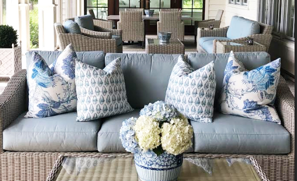 The lovely linen floral VECCHIO SPA with the JALISA coordinating pillows look so inviting with the blue shutters, topiary and bench above.