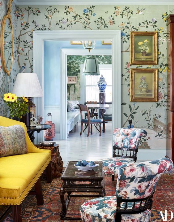 A lovely floral fabric by Schumacher on the chairs and pillow below with coordinating prints and plaids in this room by ALEXANDER REA: