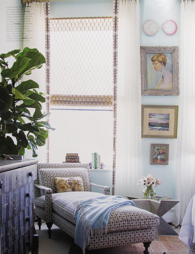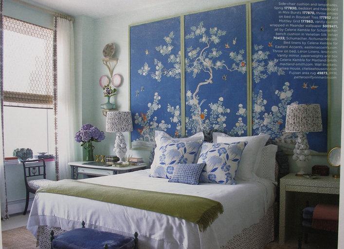 I first saw this room by Celerie Kemble and Kristen Wilson in THE BULLETIN by SCHUMACHER last Fall. The details and subtleties of colors are so exquisite. And the brighter cobalt chinoiserie panels are a nice contrast to the softer blues.