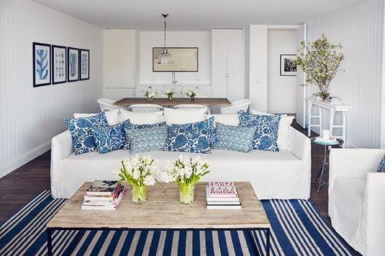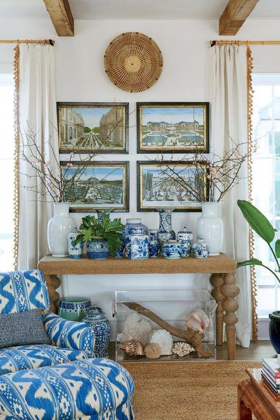 This is a casual and comfortable style. Could be the Hamptons, could be the Pacific Northwest coast, or the Australian or New South Wales coast. Stripes, indigo batik patterns, blue and white ticking. Throw in the occasional hand embroidered piece, blue and white pottery, blond or lighter wood finishes, vintage paintings.