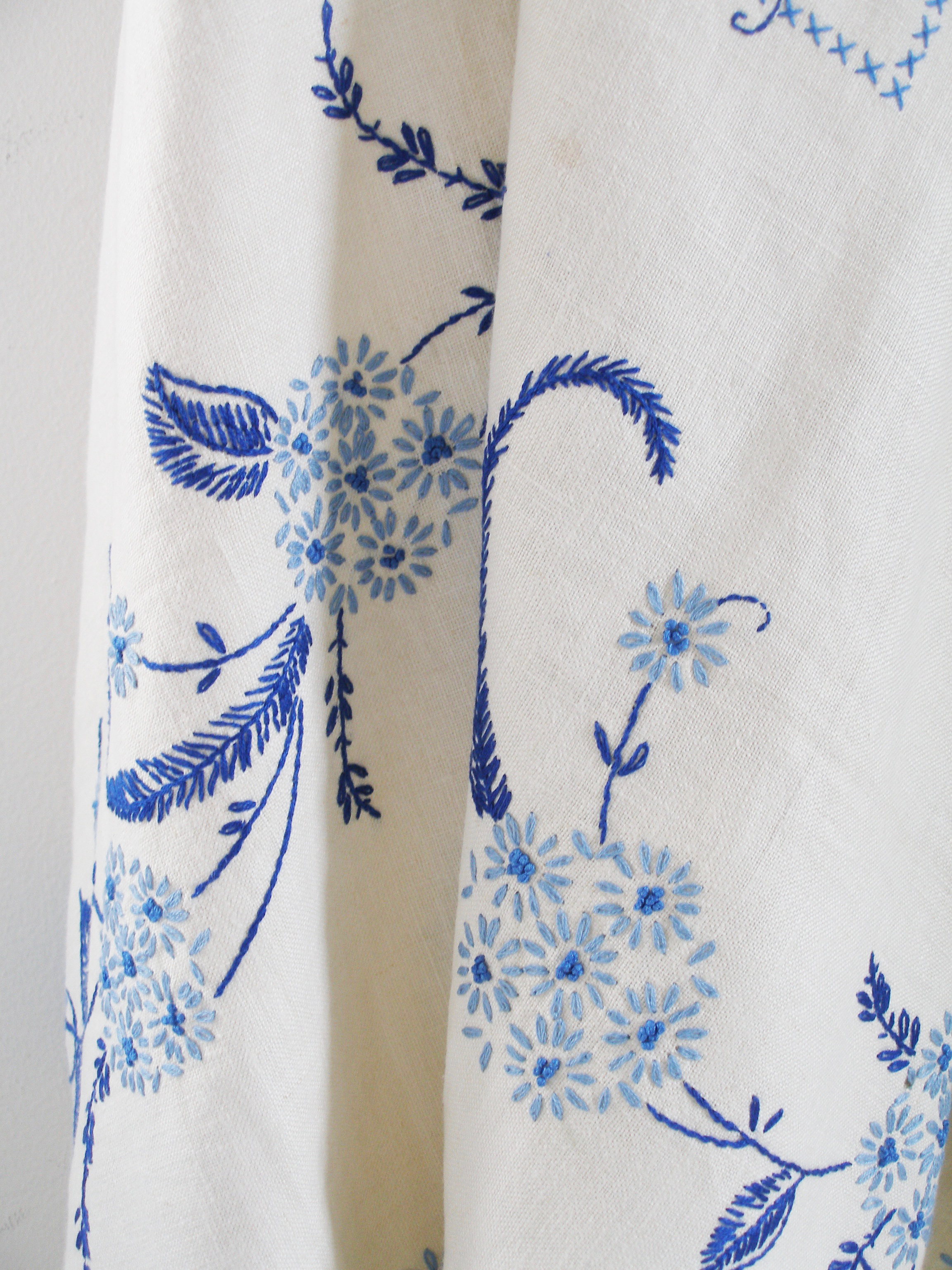 I found this linen table cloth with exquisite embroidery in shades of blue: