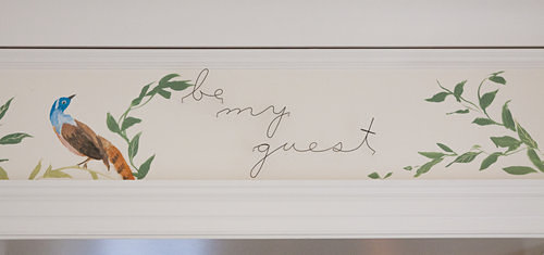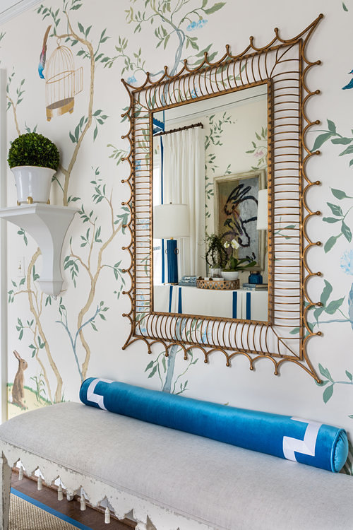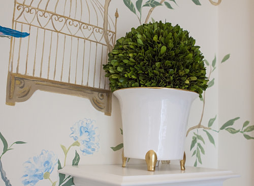 As stated in an article (see link below) by Michelle Goldchain; “Christopher Nutter’s intention for the upper gallery was to create a light, airy, and whimsical space where the walls were the art. The butterflies, flowers, and animals were hand-painted by artist Gary Goldberg. Nutter said he was inspired by Bunny Mellon and Virginia-based artist Bunny Williams, which caused him to add topiaries, a mirror from Williams’ collection, and a painting by Hunt Slonem, titled, “Untitled Bunnies.”