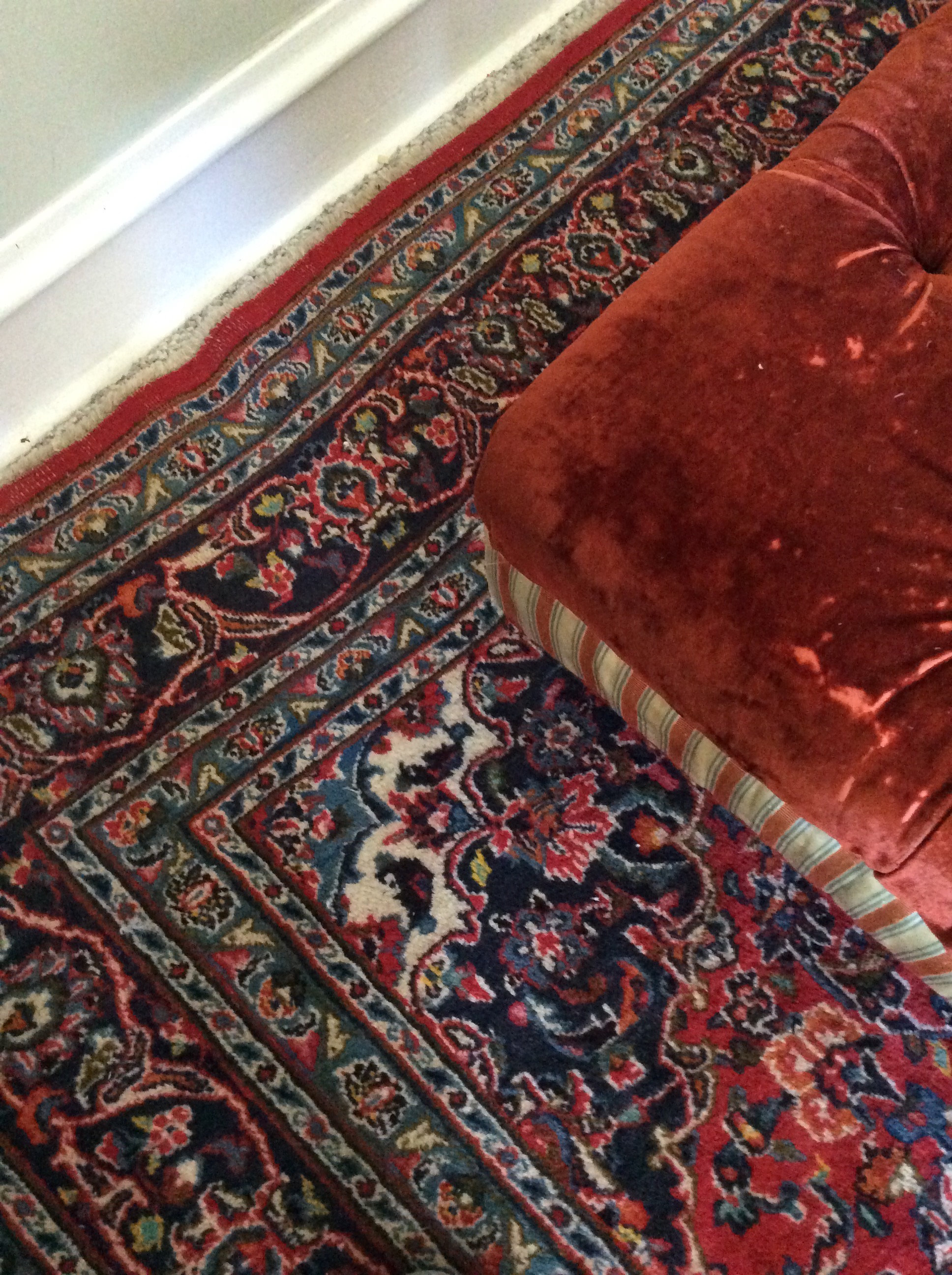 I like this rug but I am not sure it will still work. And as much as I love this old ottoman it either needs to be removed or reupholstered.