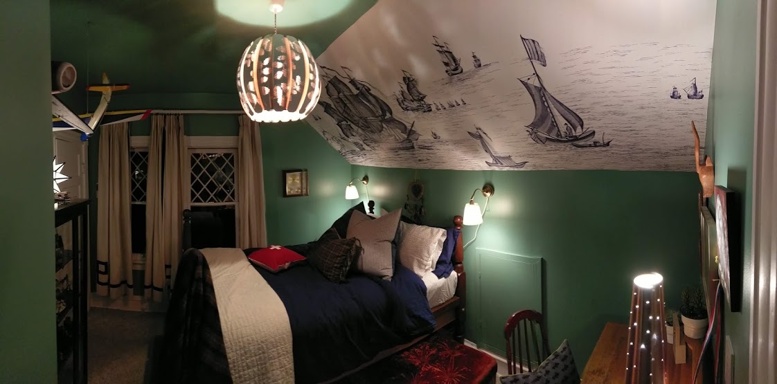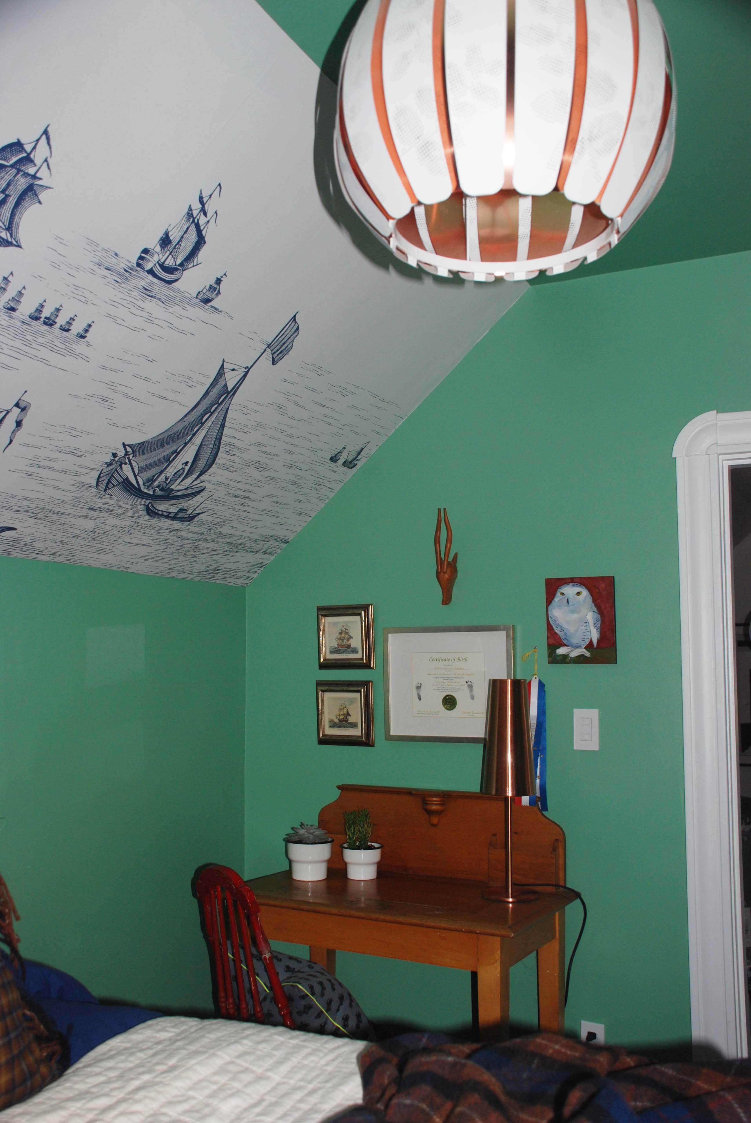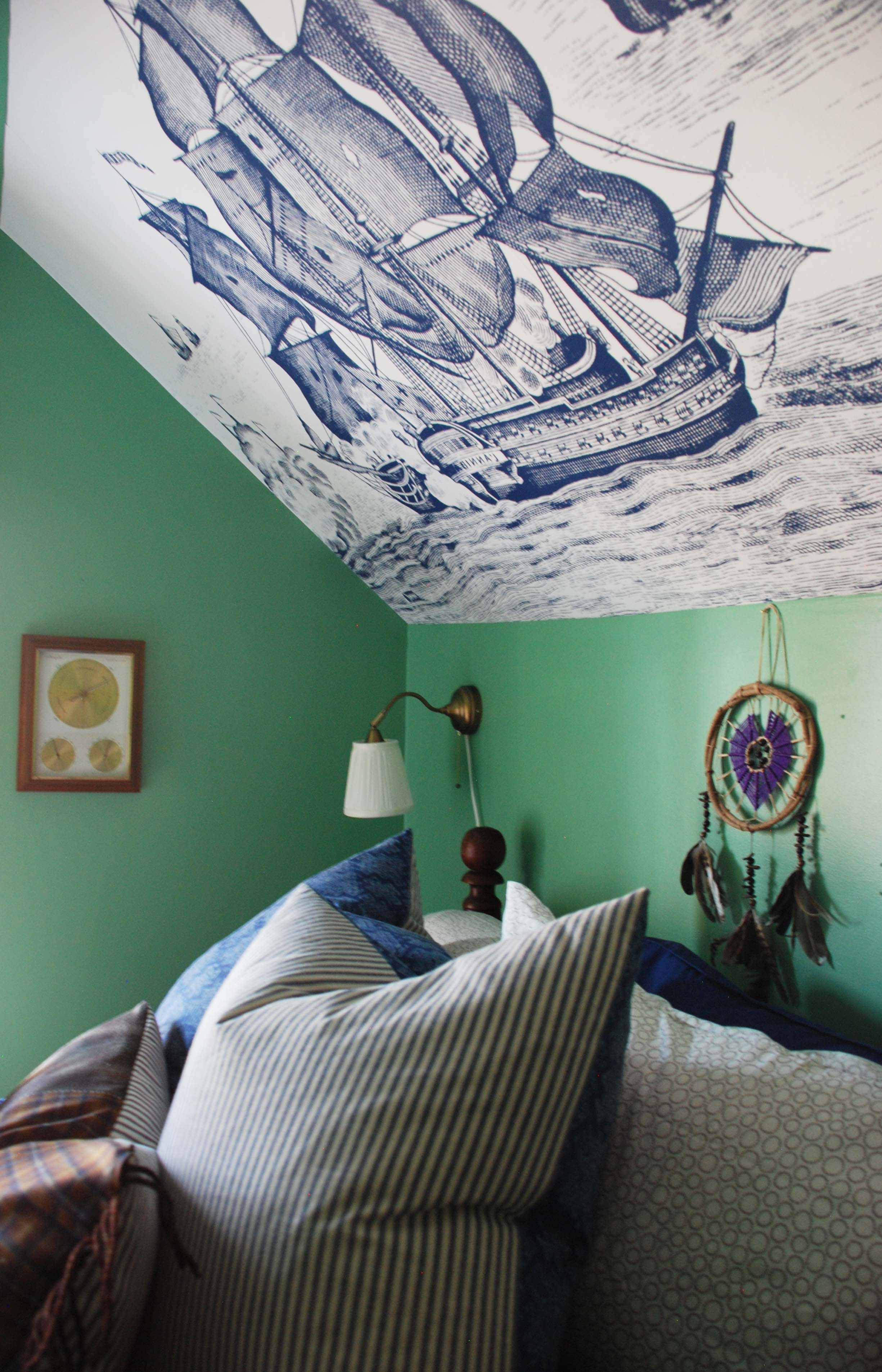 The HIGH SEAS in Henderson Blue decorative wallpaper mural was done in partnership with REBELWALLS. The design was based off of an antique etching but the scale and color gives it a modern edge. The blue is a little softer on the eyes than the black and white version we almost went with. The mural really lightens up the room. I was afraid the green wouldn’t work with the mural but somehow it does. It stands on its and I kept the color palette on the bed pretty toned down. Mostly blues, whites and browns.