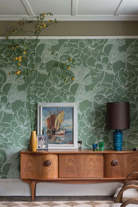 FARROW & BALL has a wonderful wallpaper called HELLEBORUS that comes in several wonderful colorways. The green is just yummy though and look how gorgeous it is with that blue ceramic lamp.