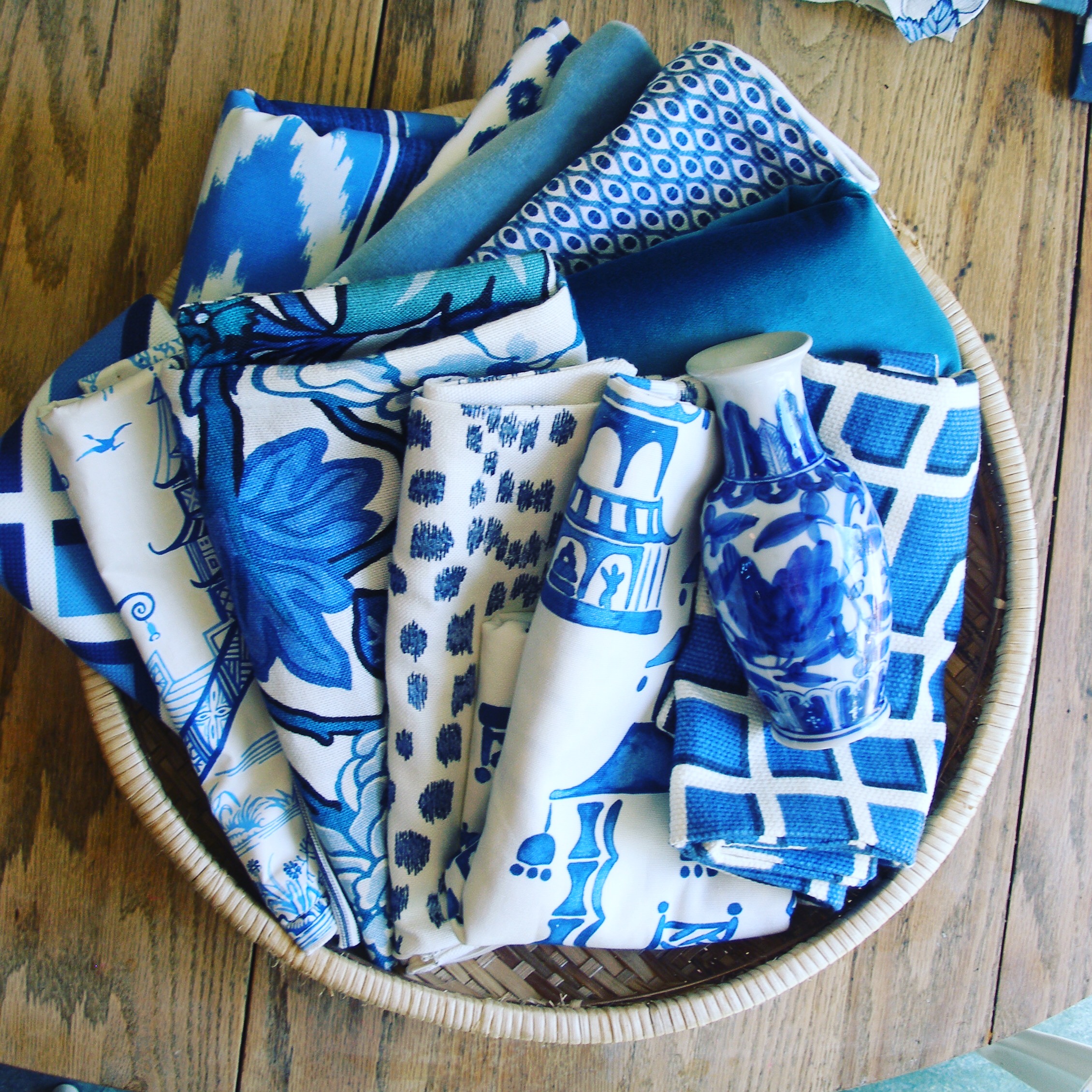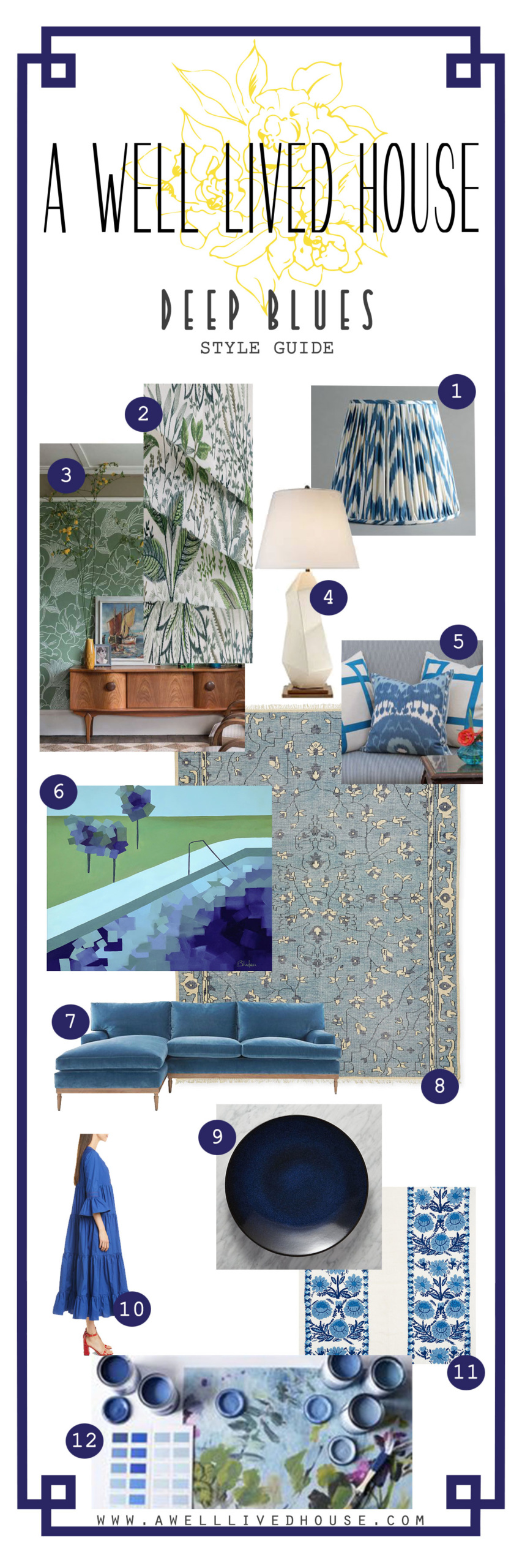 I pulled this mood board together as I was playing around with the color GREEN, botanical prints and CLASSIC BLUE. Besides white, and other shades of blue, I really like the greens in the mix.