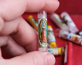 These are miniature saint candles by Pixie Hill Studio, on Etsy. I have these on my alter in my home office!