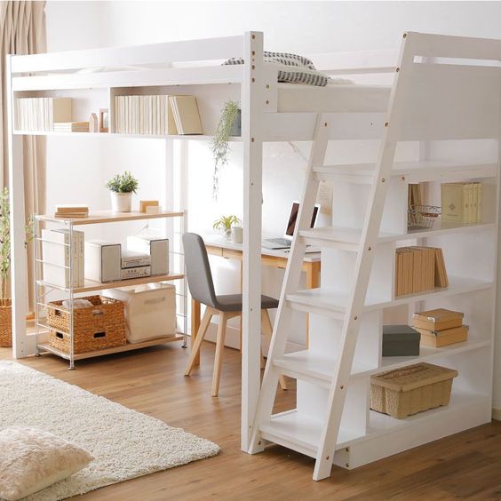This loft bed with built-in shelves under the ladder allows room for a desk and more storage space. I love the bookshelf under the bedrail.