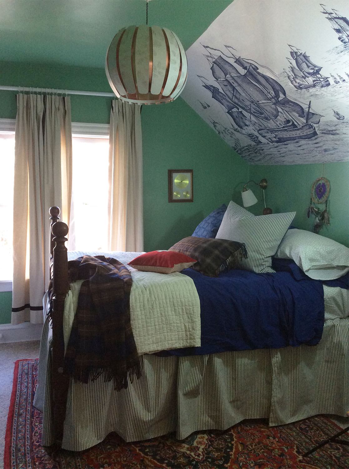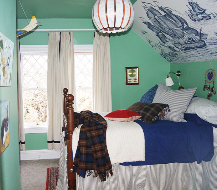 Arthur had an awesome room to begin with. The second floor location looks out over an ancient cherry tree (so it feels like a nest), has beautiful muntin/lattice trimmed windows, and a huge walk-in closet. The unusual roofline and crazy room dimensions, although challenging to work with, make it unique and charming.