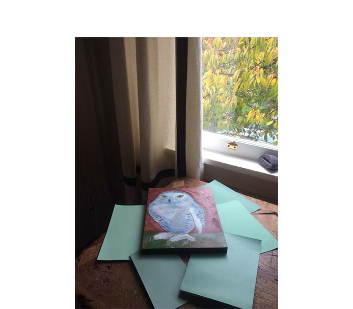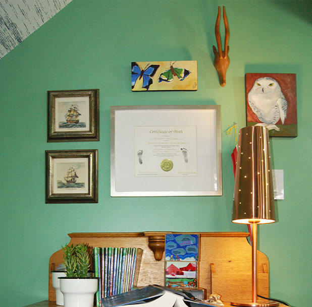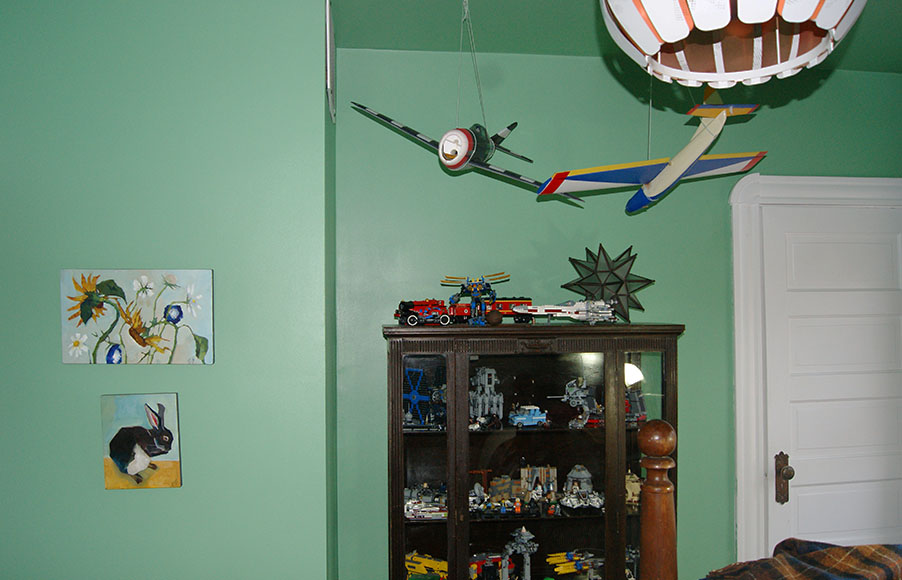 Arthur insisted that he wanted green walls as GREEN is his favorite color. Together, we considered many greens before we picked the right one. It helps if you have the beginning of a color scheme to work with, like this owl painting by local artist, ELIZABETH SEE.