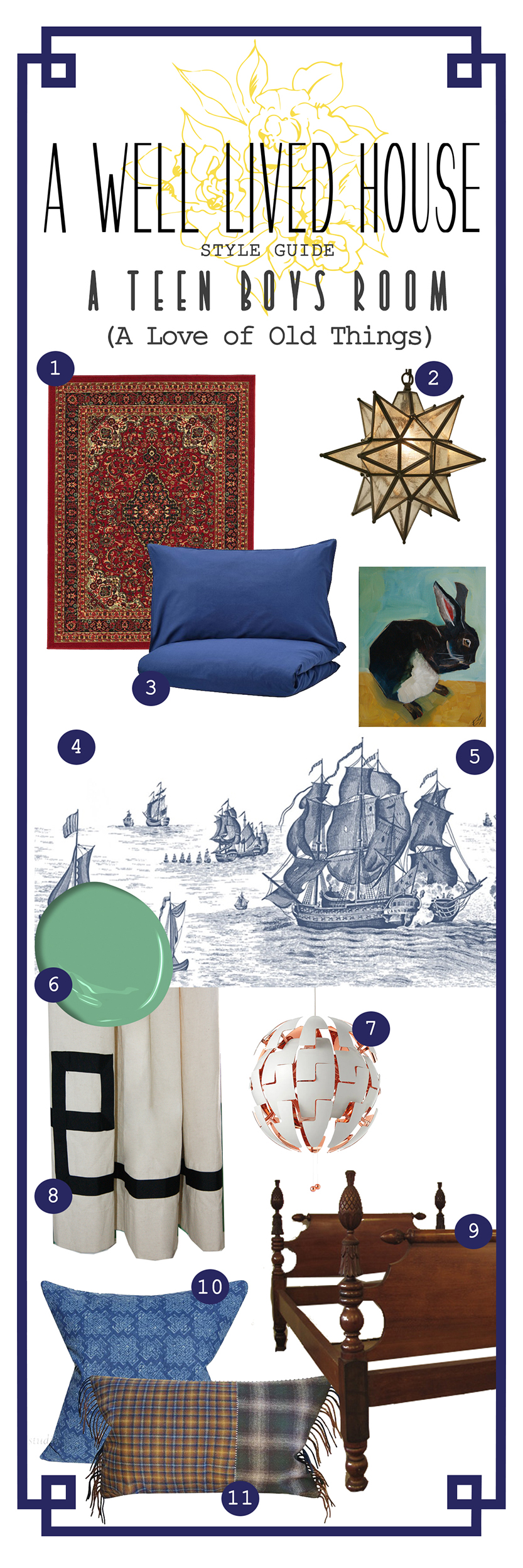 1. RUG 2. START PENDANT 3. BED LINENS 4. MURAL WALLPAPER 5. PAINTING 6. PAINT 7. PENDANT. 8. CUSTOM CURTAINS 9. ANTIQUE BED 10. PILLOW 11. PILLOW