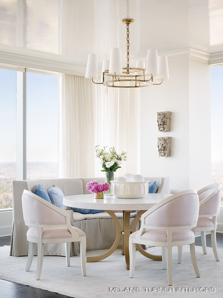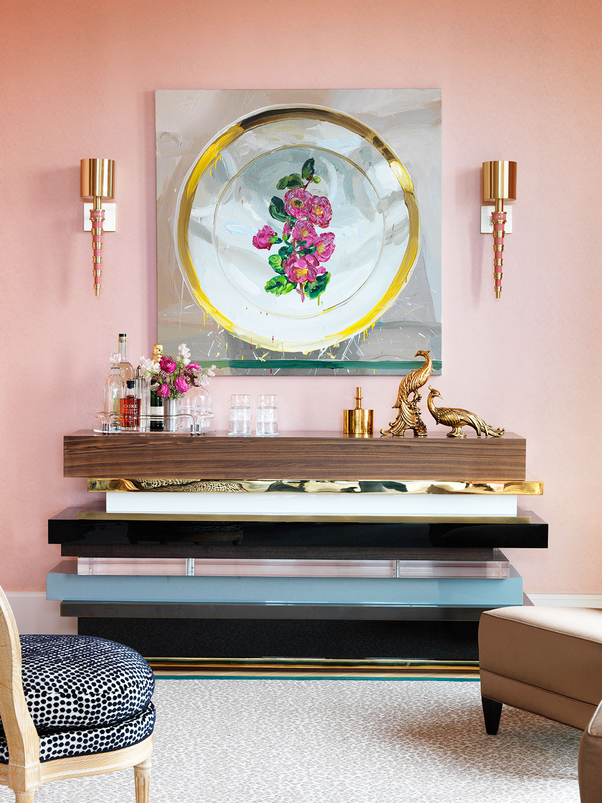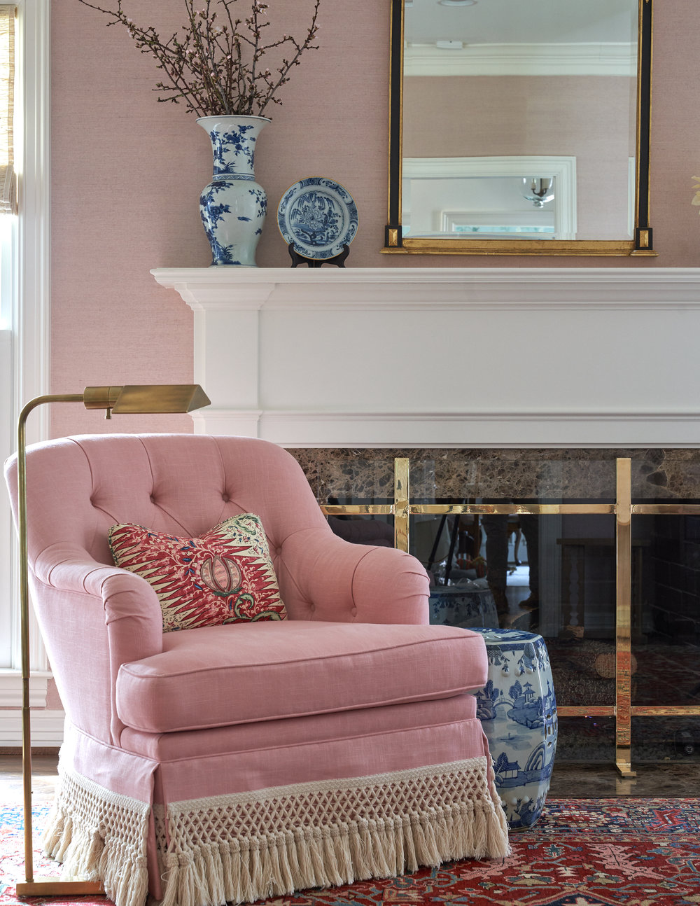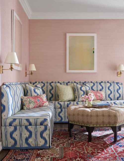 The pink textured wallpaper below adds a warm, rich back drop to the designer touches by MADRE everywhere from the sconces, to the custom banquette, tufted ottoman with trim, textiles and rug make this is a welcoming and richly appointed room .