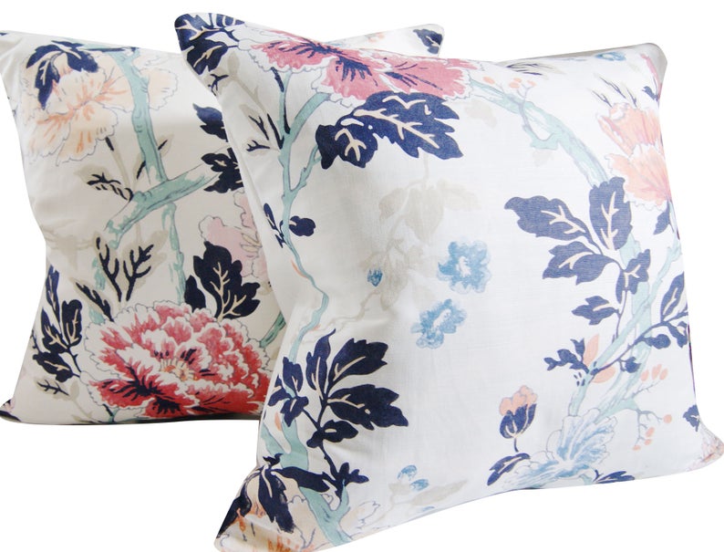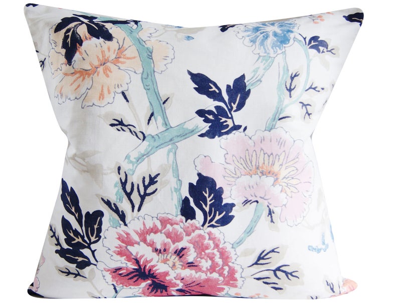This lovely floral called INISFREE in Sunset (by Kravet) features peonies in blush, pink and light blue. The touch of aqua, tan and navy blue make it modern and easy to pair with other classic colors.
