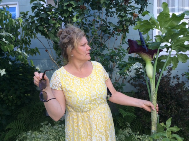 We’ve got lots of ferns in our garden in the Pacific NorthWest. Something out of character for our region that we find every year is this odd phenomenon of a flower, called the CORPSE FLOWER. It smells like rotting flesh, believe it or not. Hence the name.