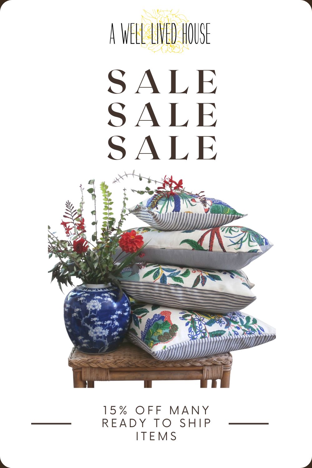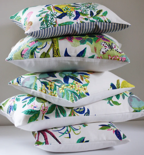 Citrus Garden by Josef Frank in primary is a favorite of mine. Red was the only color in my garden last week that worked with this latest batch of pillows. Almost looks patriotic with the blue and white chinoiserie thrown in, which was not really my intention, but pretty nonetheless.