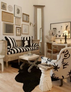 I have some images of his wonderful black and white rooms, in which he often uses neutral upholstery, linens, black and white prints, photographs. He loves large-scale busts of great men, in plaster, carved, and as silhouettes on paper, framed or on pillows.