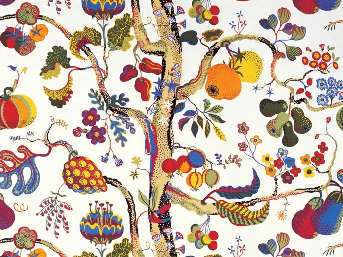 “Josef Frank and Anna left Sweden for the United States during World War II. Frank taught at the New School in New York and tried unsuccessfully to work on public housing projects. After their return to Sweden in 1946, he abandoned architecture (except in his paintings), and focused on Svenskt Tenn. There, he reinterpreted favorite historic styles again in more than 2,000 pieces of furniture, but he was — and remains — best known for the textiles he designed featuring surreal organic forms in vibrant colors”.