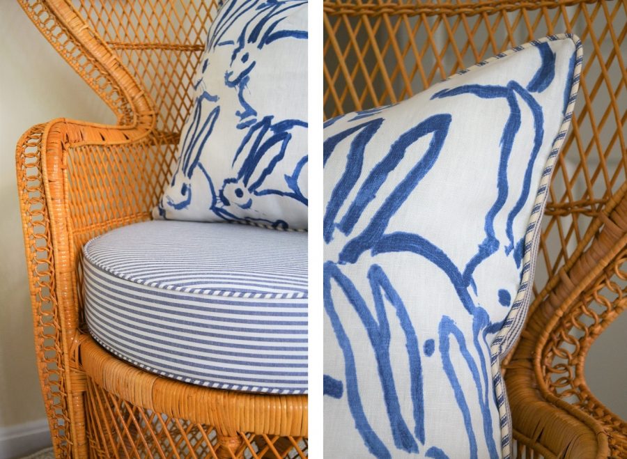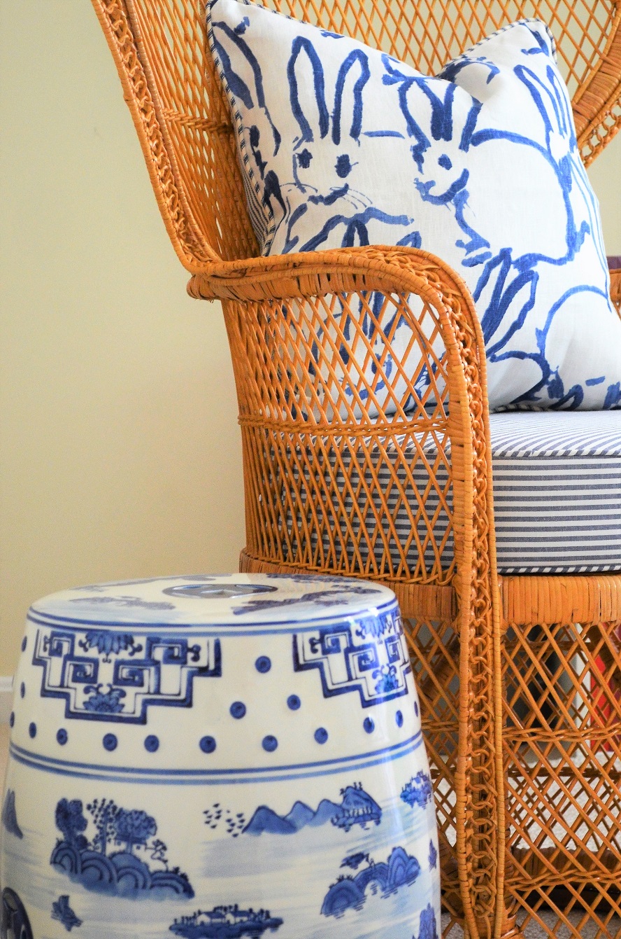 She features STUDIO TULLIA’s BUNNY HUTCH PILLOW which she has paired with a thick tailored seat cushion by PILLOW LOFT HOME DECOR on a vintage peacock chair. The gorgeous ceramic CHINOISERIE GARDEN STOOL is from DECOR MARKET.